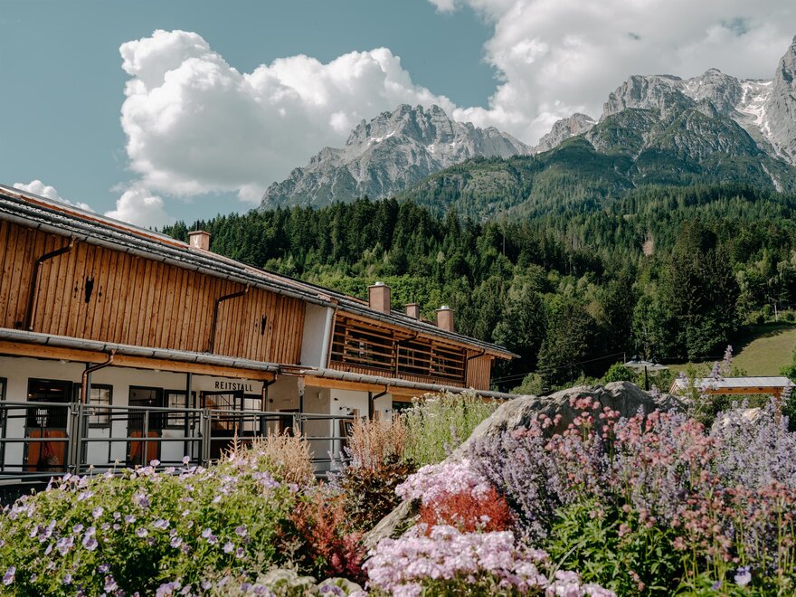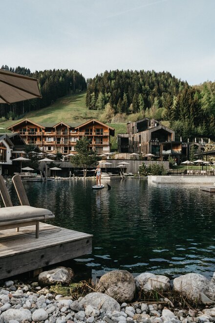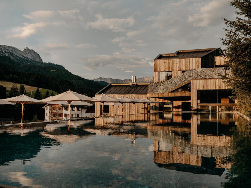 Umgeben von Wiesen und den hauseigenen Wäldern an den Hängen des Asitz, besticht das Naturhotel auf 5-Sterne Niveau