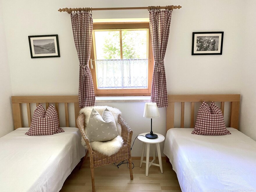 Zwei Schlafzimmer: Hauptschlafzimmer südseitig mit super komfortablen Boxspring Doppelbett, zweites Schlafzimmer mit Blick auf die Leoganger Steinberge und zwei Einzelbetten aus Vollholz mit Bio-Matratzen. Bad mit Dusche, getrenntes WC, kostenloses Wifi.