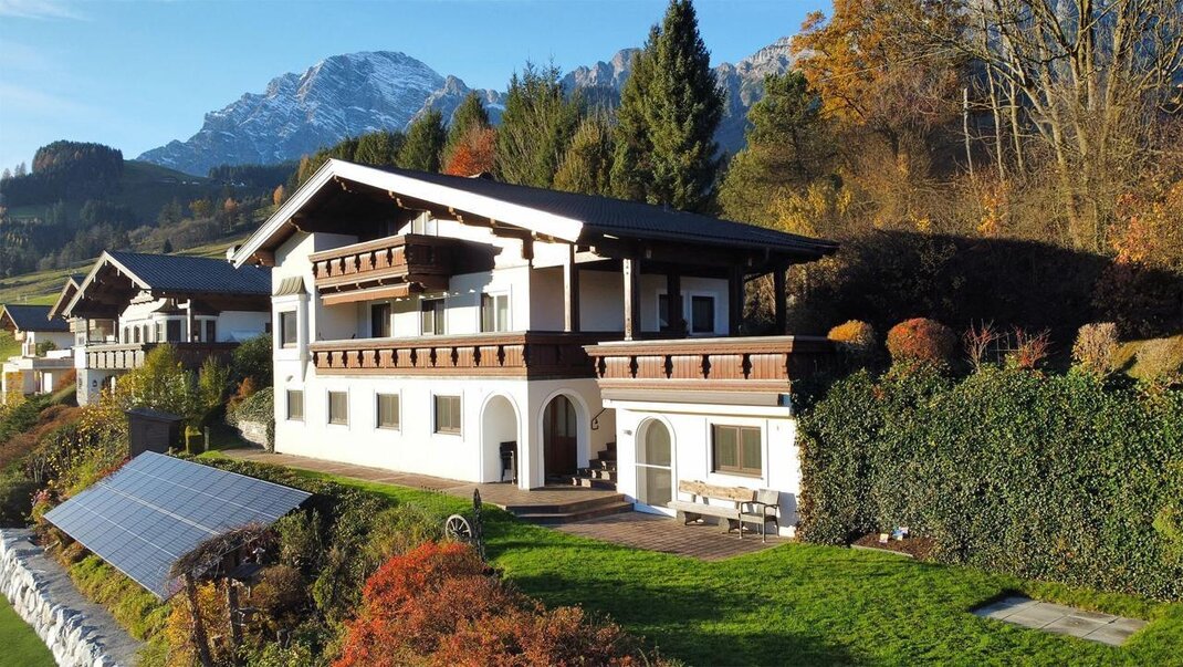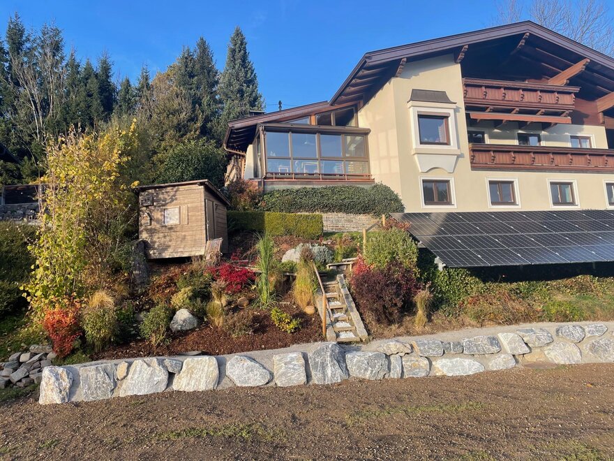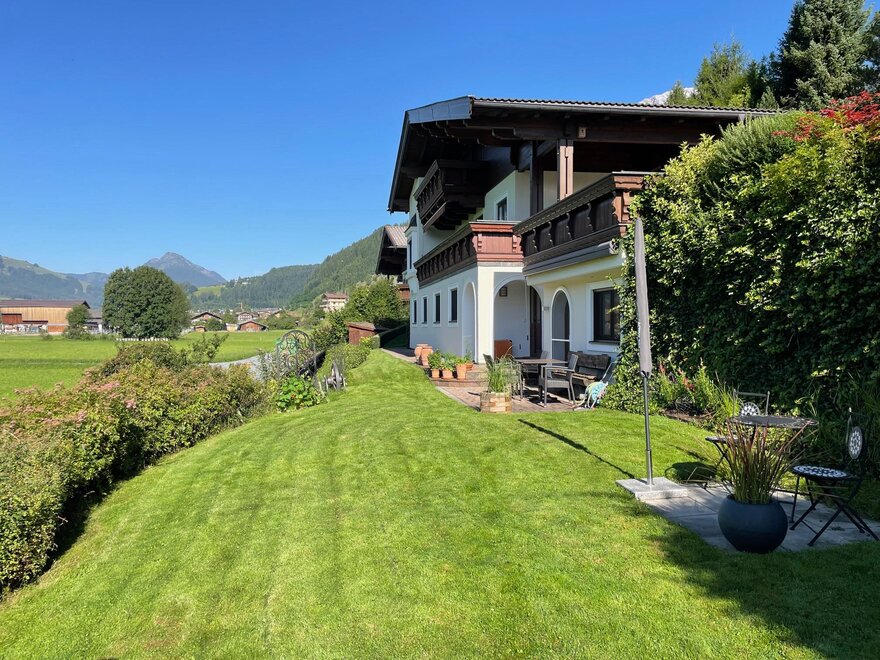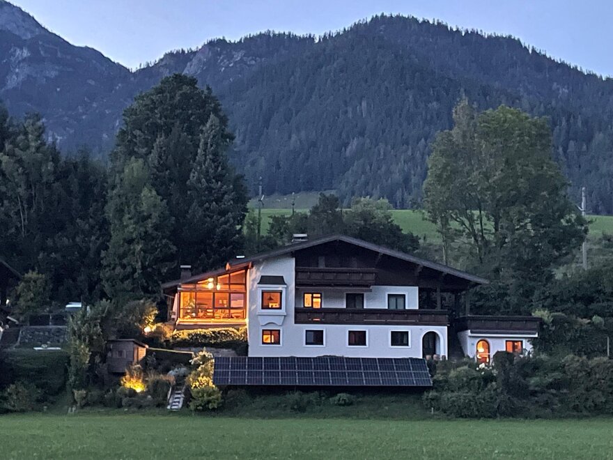 Ruhiges sonniges Landhaus in leichter Hanglage mit guter Zufahrt verfügt über zwei Ferienwohnungen. Das Ferienhaus kann von zwei verschiedenen Gruppen in der jeweils passenden Ferienwohnung (140 m2 bzw. 80 m2) gemietet werden. Die erhöhte Hanglage des Hauses ermöglicht einen freien Blick vom Hochkönig im Osten bis zum Schigebiet im Westen. Ebenso einen freien Blick in das Saalfeldener Becken. Genauere Informationen ersehen Sie in der Hompage. Das Ferienhaus ist südseitig ausgerichtet und durch diverse Balkone bzw. Terrassen können Sie die Sonne ganztags genießen. Bedingt durch eine sehr zeitgemäße Wärmedämmung ist das Haus in den Hitzetagen angenehm kühl zum Schlafen und im kalten Winter eine Wärmestube.  Achtung: NICHTRAUCHERHAUS und keine HAUSTIERE