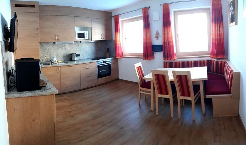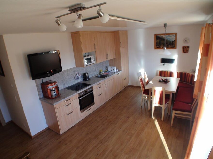 Ferienwohnung, gemütlich eingerichtete Wohnküche TV und WIFI, 1 Schlafzimmer, 1 Bad mit Dusche und separates WC