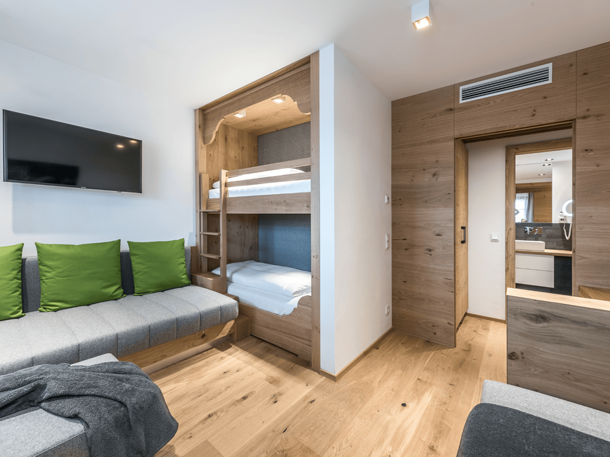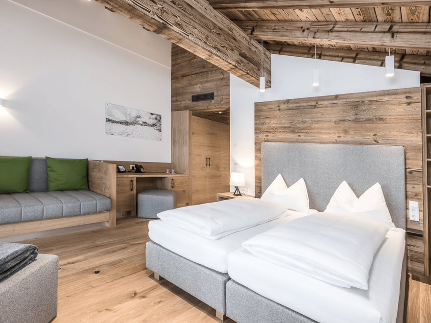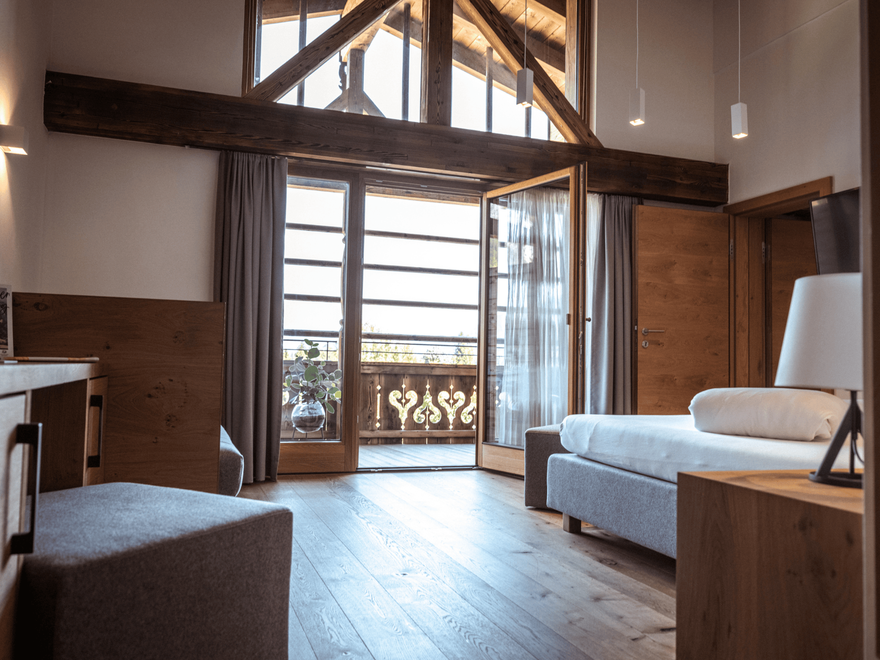 76 stilvolle Suiten und Familienzimmer bieten Raum für 2–6 Personen – mit großzügigen Betten, weitläufigen Terrassen und zeitlosem Design aus natürlichen Materialien.
