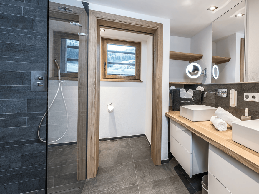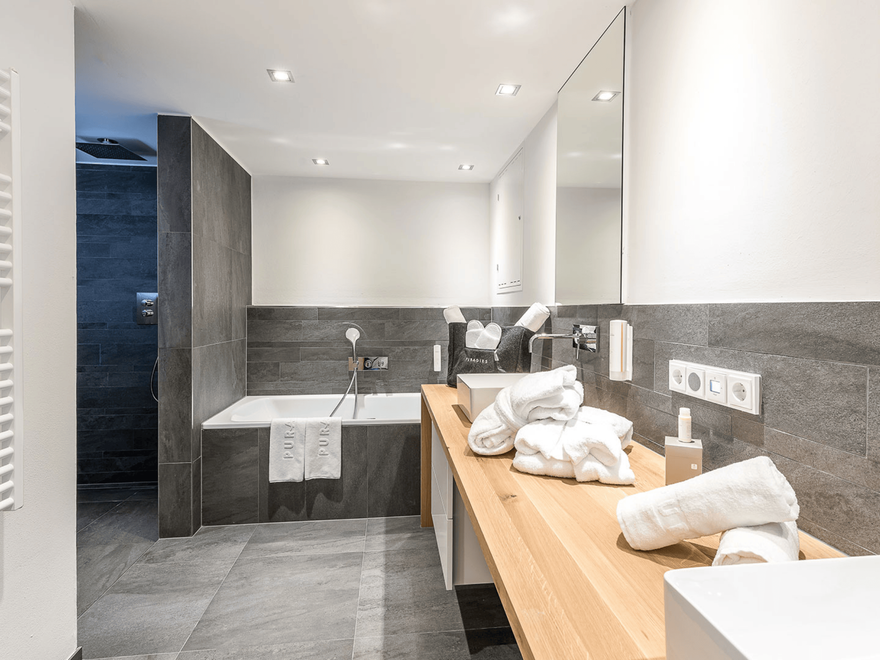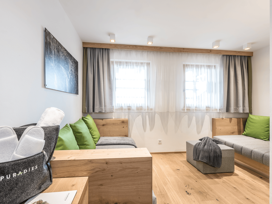 Die Puradies Premium Suite bietet auf 55 m² Platz für 2 bis 6 Personen und umfasst ein Wohn-Schlafzimmer mit Daybed und Stockbett sowie ein separates Schlafzimmer. Zur Ausstattung gehören TV, WLAN, Telefon, Safe, Minibar, Erlebnisdusche und/oder Badewanne, eine über 10 m² große Terrasse, Kaffee-/Espressomaschine, Yogamatte und Klimaanlage für einen komfortablen Aufenthalt.
