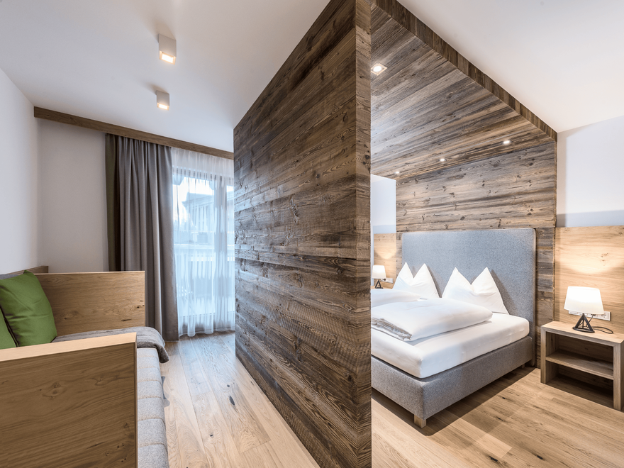 Die Puradies Deluxe Suite bietet auf 35 m² Platz für 1 bis 3 Personen und überzeugt mit einem stilvollen Wohn- und Schlafbereich mit Daybed. Zur Ausstattung gehören eine Erlebnisdusche, ein Balkon oder eine Terrasse sowie moderne Annehmlichkeiten wie Klimaanlage, WLAN und Kaffeemaschine für einen rundum komfortablen Aufenthalt.