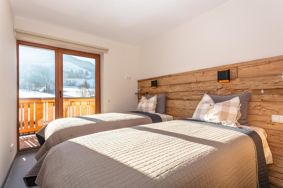 Die Ferienwohnung Asitz hat 58 m² und befindet sich im 1. Obergeschoß. Ost-Westbalkon mit Aussicht auf die Skipiste vom Hinterreit und die Kapelle von Almdorf.
