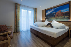 Geräumiges und rustikal eingerichtetes Doppel- bzw. Dreibettzimmer mit Balkon, Kabel-TV, W-Lan, Safe, Haarföhn, großzügiger DU/WC Raum