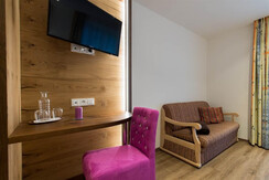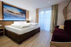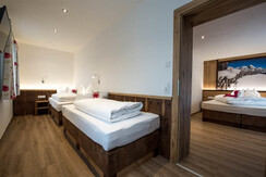 Sehr schönes, modern-rustikal eingerichtetes Drei- bzw. Vierbettzimmer mit Balkon, Kabel-TV, W-Lan, Safe, Haarföhn geräumigem DU/WC Raum.