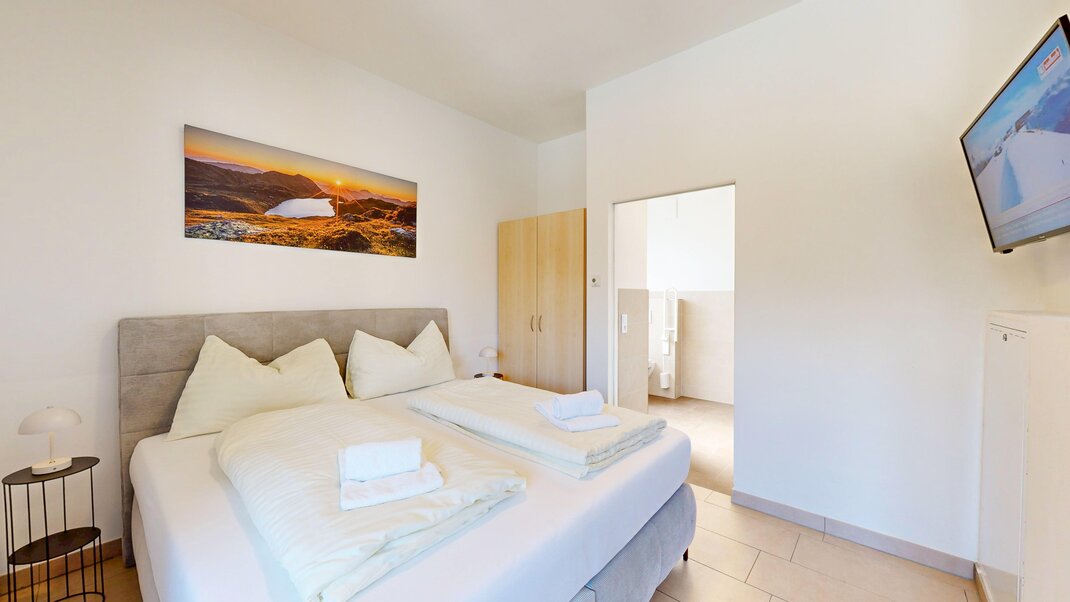 Ein gemütliches Boxspring-Doppelbett sowie eine Sitzmöglichkeit mit Tisch und Stühlen warten hier auf Sie. Unterhaltung durch Sat-TV ist natürlich gegeben.