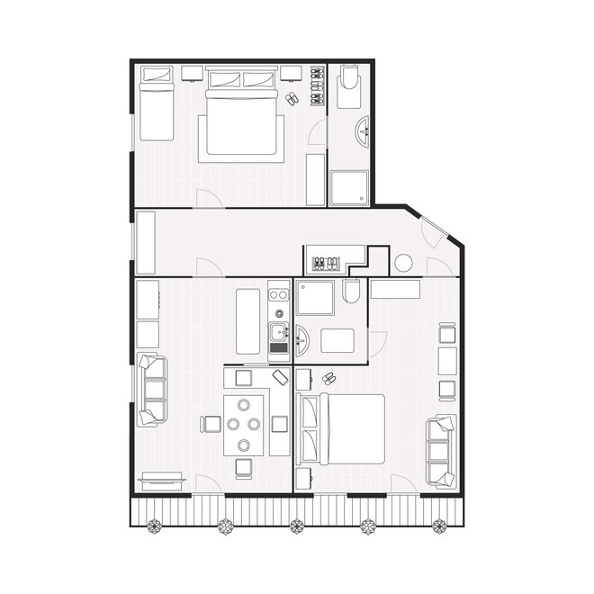 Einen besonderen Flair vermittelt unser gemütliches, großzügig ausgestattetes Appartement (ca. 65m²) mit Vorraum, Wohnküche mit Kochnische, Geschirrspüler, Backofen, E-Herd, Kühlschrank mit Gefriermöglichkeit, Kaffeemaschine, Wasserkocher, Toaster, Geschirr, Eckbank und Sitzgruppe, 2 sep. Schlafzimmern (Mehrbettzimmer), Dusche, zwei Waschtischen und 2 mal WC, südseitigem Balkon, Kabel-TV und freies W-LAN.