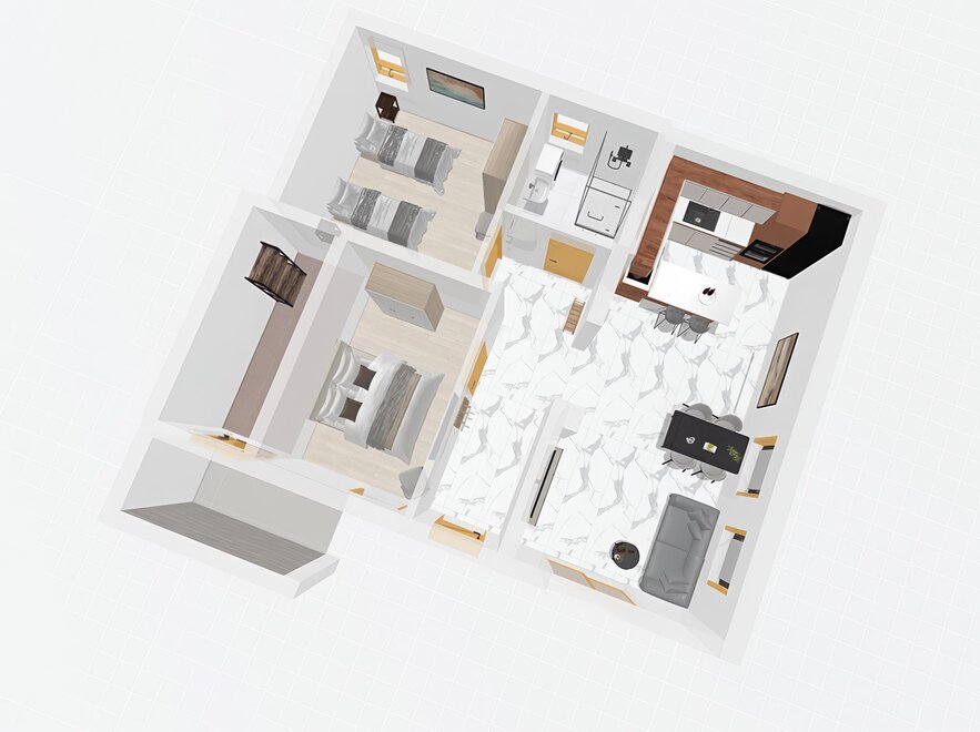 Eine gemütliche Wohnung mit zwei separaten Schlafzimmern (eines mit einem Doppelbett, eines mit zwei Einzelbetten), einem Badezimmer mit Dusche und einem geräumigen Wohnzimmer mit offener Küche sowie einem großen Schlafsofa.