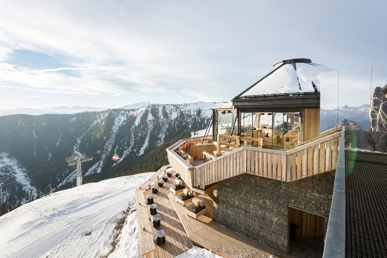 In winter, the hendl fischerei directly at the Steinbergbahn & Asitzbahn mountain station provides you with warming drinks and cool beverages in any weather. At lunchtime, Huwi's world-famous grilled chicken, delicious fish specialties and other culinary delicacies are served there - casually accompanied by the typical Ibiza DJ sound.