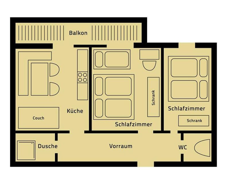 Gemütlich eingerichtetes Appartement mit 2 Schlafzimmern, Wohnküche , Dusche , WC , Vorraum und Balkon.