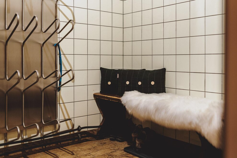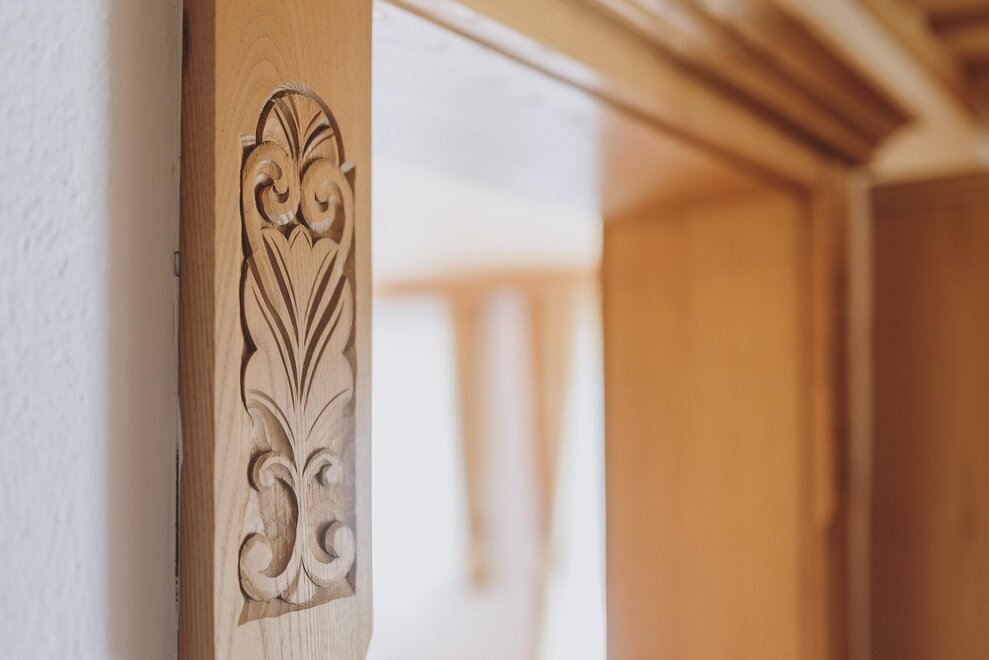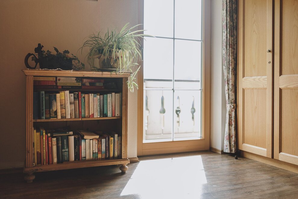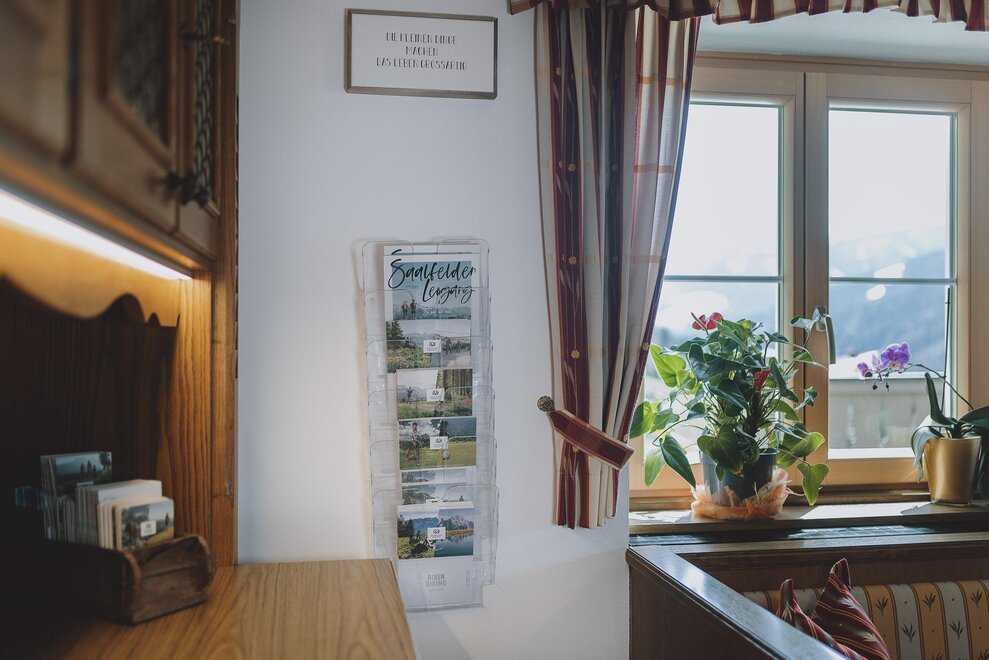 helles Doppelzimmer mit Dusche und WC, 1. Stock, Blick nach Norden auf die Leoganger Steinberge, helle Möbel, Garderobe und Sitzbank, Parkettboden für Allergiker geeignet!