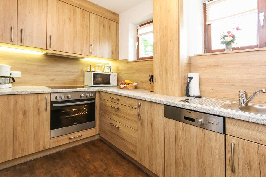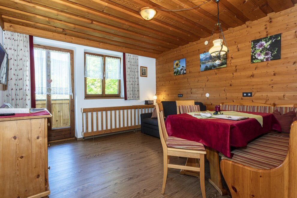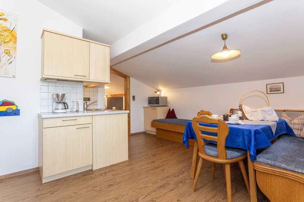 4-5 persons (50 sqm): 1 parents bedroom, 1 children's room with 2 single beds (open bottom part of the beds), shower/WC, large kitchen living with sofa-sleeper (5th person), corner seat with large table, kitchen with 2 hot places, microwave, coffee machine, fridge, water boiler, cable TV, radio, locked balcony on the top floor, towels available! Fantastic view to the mount of Schwalbenwand.