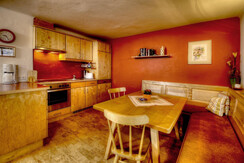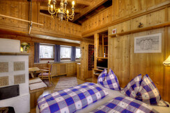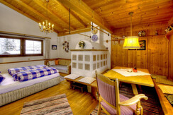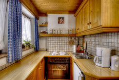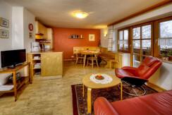 This apartment (No 1) is a studio with 40 sqm + 15 sqm on two levels. It is furnished in country style On the first level (40 sqm) you will find cloak room, bathrooms (toilet and shower in separate rooms), kitchen, dining area and the living/sleeping area, separated by the lovely tiled stove. The balcony faces south and offers a great view to the surrounding summits with the Kitzsteinhorn.