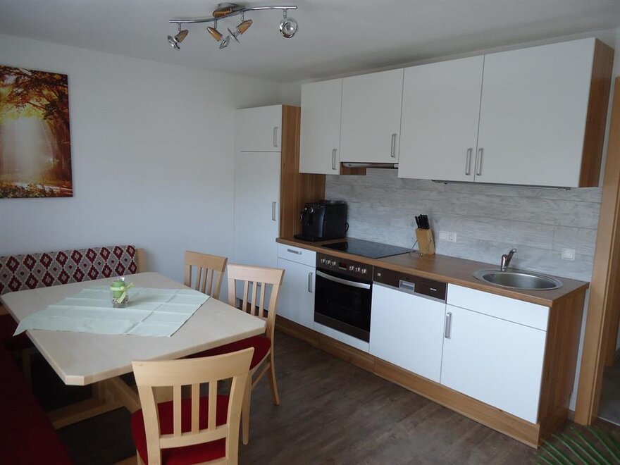 Renovated Appartement with 1 kitchen, 1 living room, 2 bed rooms with double bed, bath room with tub and washing maschine, toilet separat. Balcony with view to the south & the Leoganger Steinbergbahn