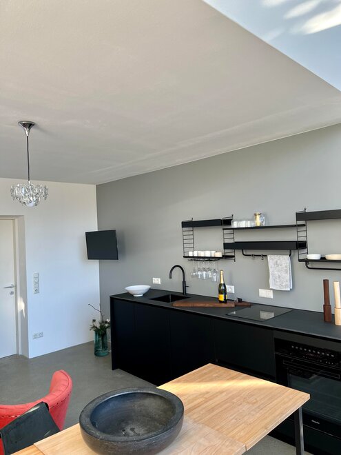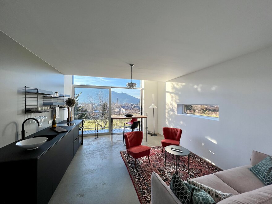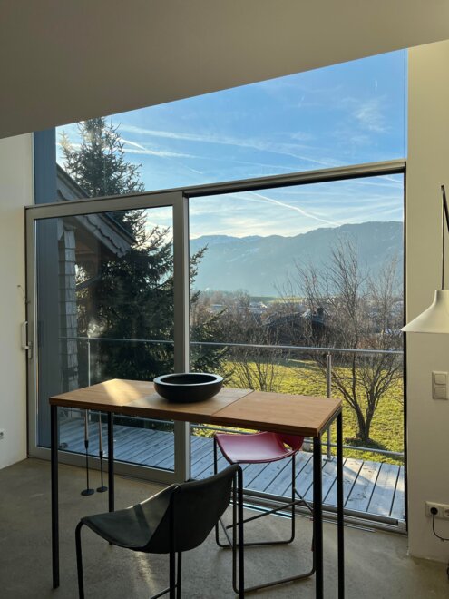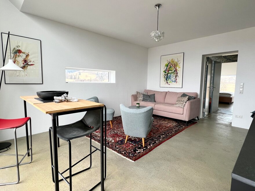 We have expanded our traditional 15th century farmhouse with a modern, award-winning extension, which we rent out to holiday guests. Our guests experience maximum holiday enjoyment on approx. 50 m2 with a unique view. Our guests can also use swimming pool. On furnishing the two rooms (living room with kitchen and bedroom by Prader Interior) we rely on high quality - the products used can also be purchased in the in-house shop. The painter Barbara Mitteregger is responsible for the pictures on display.