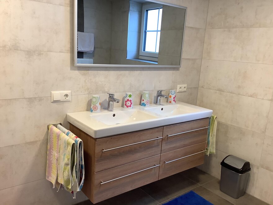 double sink, separate toilet, running hot/cold water, shared toilet, shower, toilet, bath
