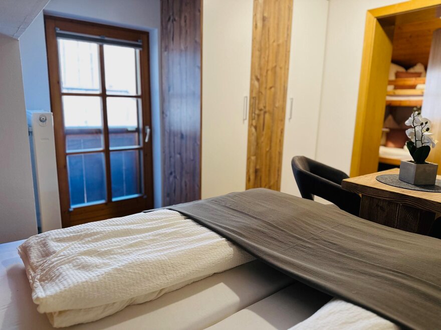 The bedroom consists of a large double bed. A connecting door leads to the second room, where there is a bunk bed for 2 people. In the kitchen/living room there is a sofa bed, which can be used as an additional bed. We are also happy to provide you with a crib on request.