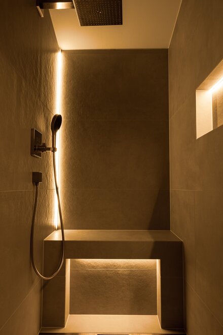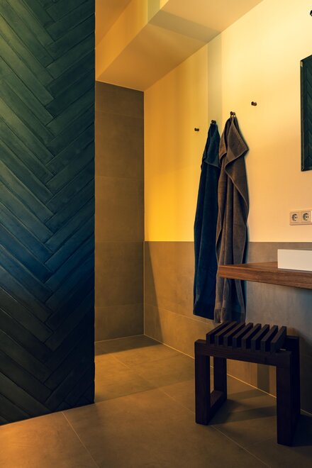 The stylish bathroom features a high-quality bathtub, a spacious rain shower, and a heated bench – perfect for unwinding after a day on the slopes or mountain trails.