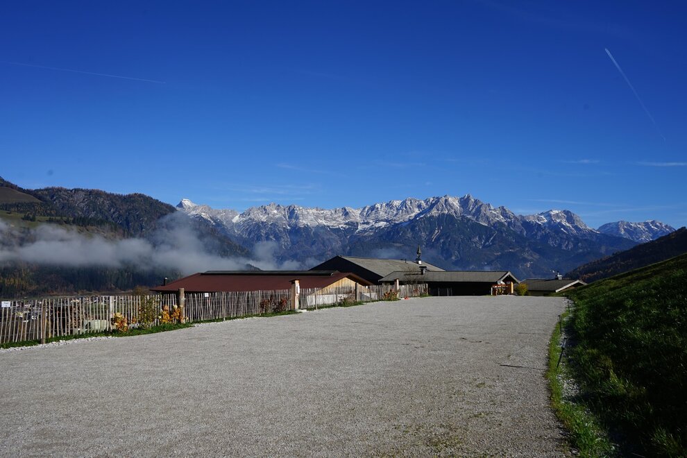 Away from the tourist hotspots of Leogang, our breathtaking view of the Steinberge invites you to relax and unwind. The center of Leogang is only a few minutes' walk away. The nearest grocery store is 1.2 km away and the swimming pool is a 15-minute walk away. Numerous hikes start directly from the farm, and the nearest bus stop is only 5 minutes away. In winter our campsite is located directly at the Schteil lift. In addition to our family, our farm dog Nala, our traditional Pinzgau cows and our cats Murli and Max also live on the farm. Our pitches are equipped with electricity, fresh water and WiFi. We also have a disposal station for gray and black water.