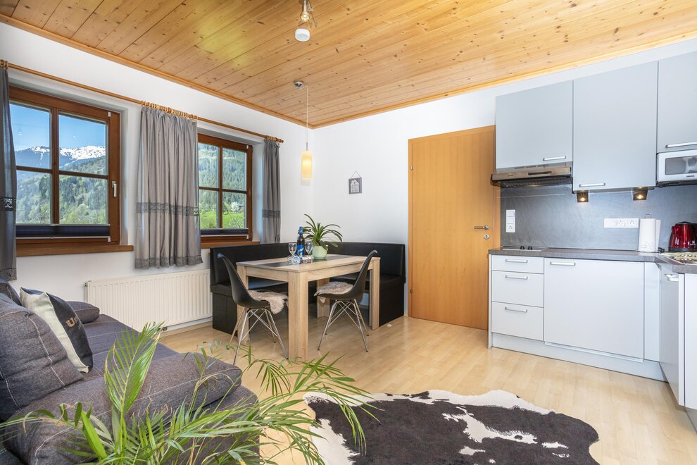 "Gemütliches Appartement"Das Appartement Enzian verfügt über ein separates Schlafzimmer, einen großen Wohnraum mit gut ausgestatteter Küche, ein Badezimmer und ein WC. Das Schlafzimmer ist mit einem Doppelbett und einem Einzelbett ausgestattet. In der großen Wohnküche befinden sich ausziehbare Sofas.